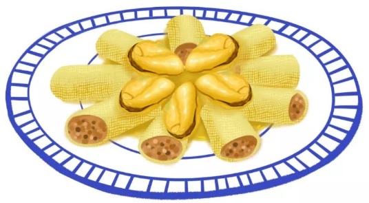 取干净的青花瓷碗,碗底先放入五个淡菜,摆成梅花的式样。然后放入豆腐皮肉卷,一段一段摆放整齐。