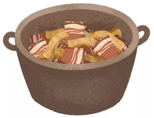 从菜场买来五花肉,洗净,和水发笋干丝一起红烧,放入中号钵体中,就是荤什锦。