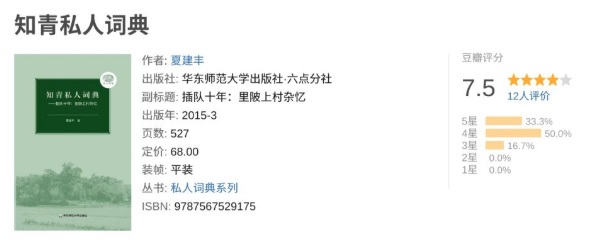 夏老师出版的另一本《知青私人词典》在豆瓣上评分7.5。