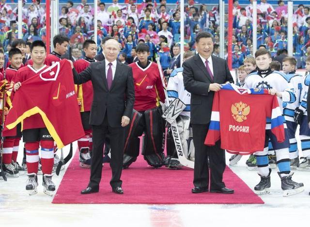 2018年6月8日晚,在欢快的乐曲声中,国家主席习近平同俄罗斯总统普京来到天津体育馆,共同观看中俄青少年冰球友谊赛。
