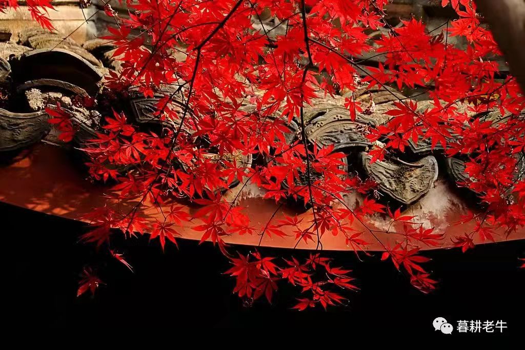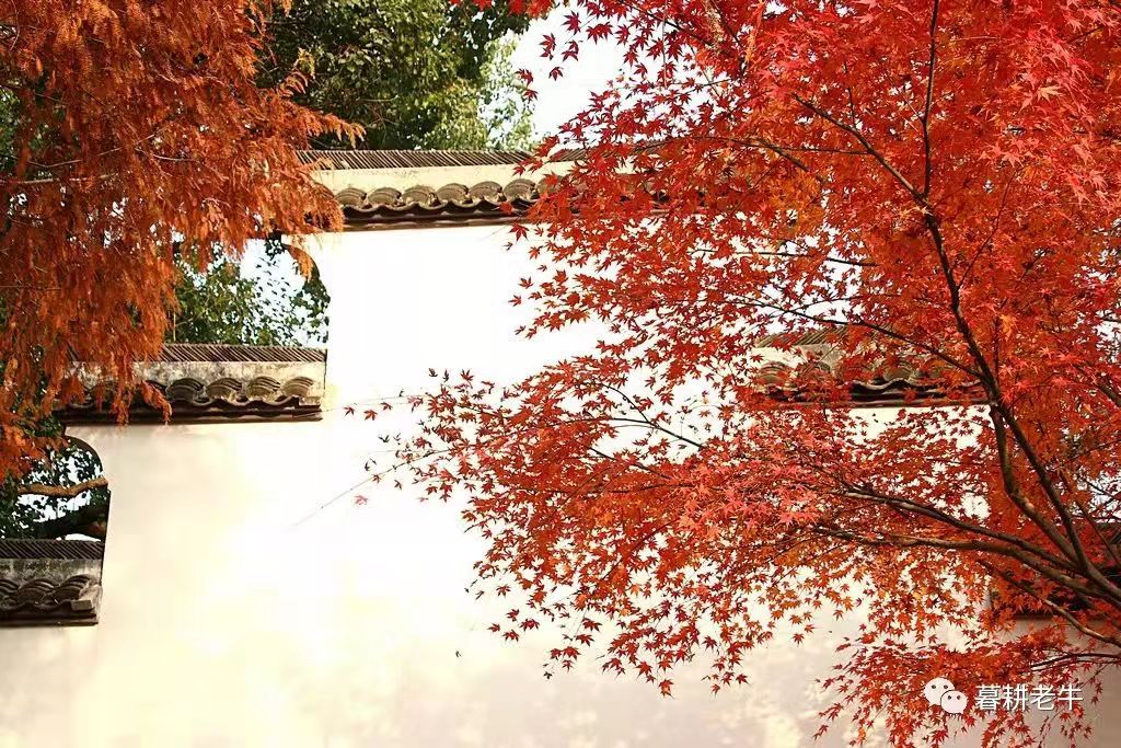 红枫如火般燃烧,银杏、梧桐、黄连、乌桕等却飘起了金黄的色彩,靠着楼台,傍着长廊,临着水池,照着黛瓦,为着这处处的红云,增添无限的色彩。