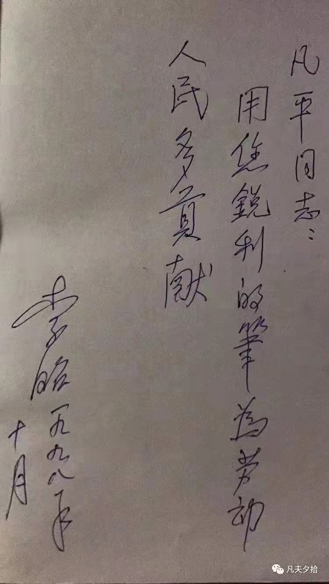 李昭当即允诺,提笔写下这样一行赠言:凡平同志,用您锐利的笔为劳动人民多贡献。