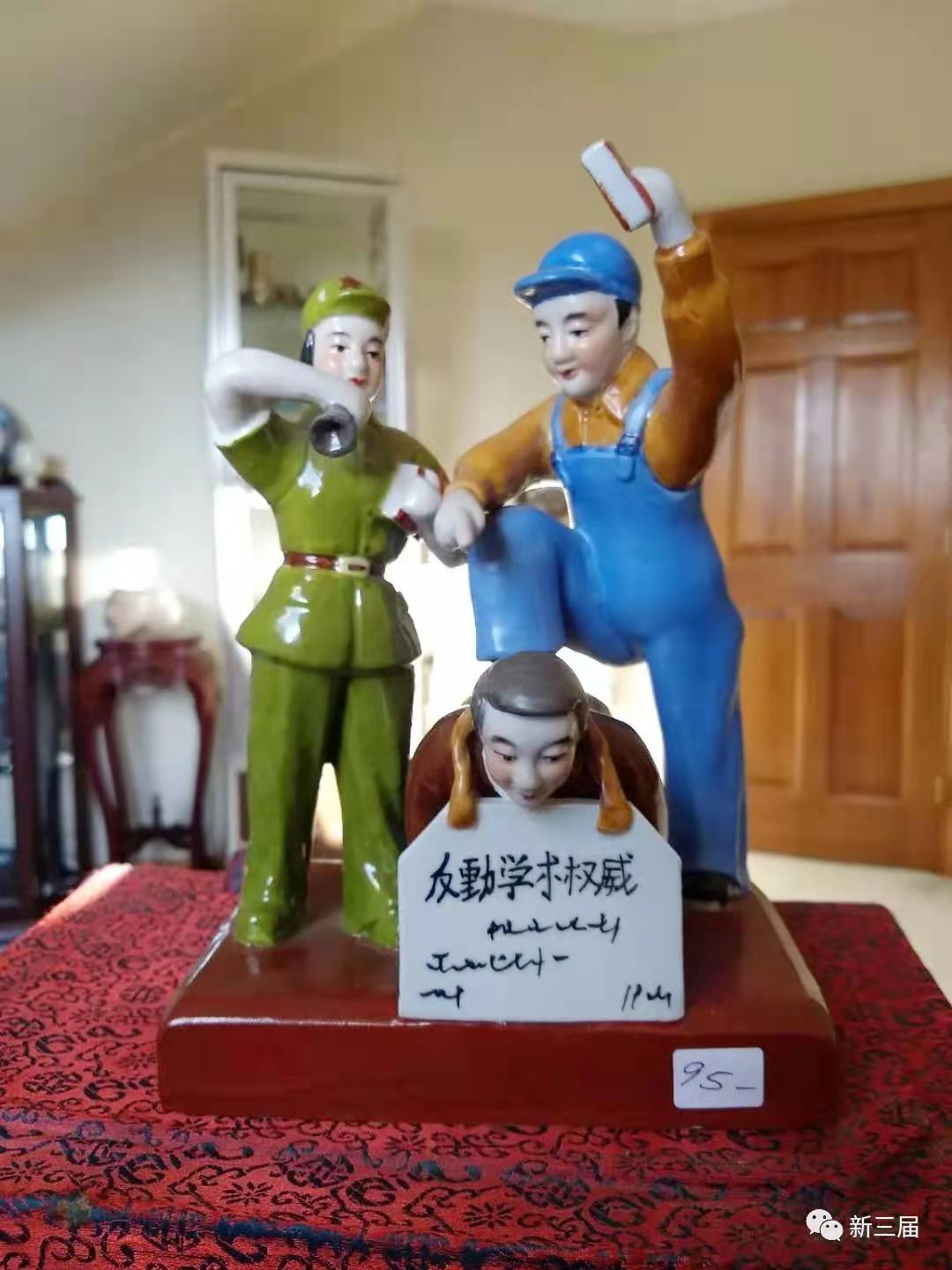 这个瓷器生动地再现了儿时目睹的情景。一个牌上写着"反动学术权威"者挂牌跪下,背后站立着一手拿话筒,一手拿《毛主席语录》的红卫兵,代表奉上而持有话语权。另一个工人着装者,一手举语录,一手直指着被其脚踏于脚下者的头,昂然挺立于后,展现奉谕而为,群众专政,大义而凜然。脚踏之下跪着挂“反动学术权威"大木牌者,表明其被剥夺了基本做人之权。