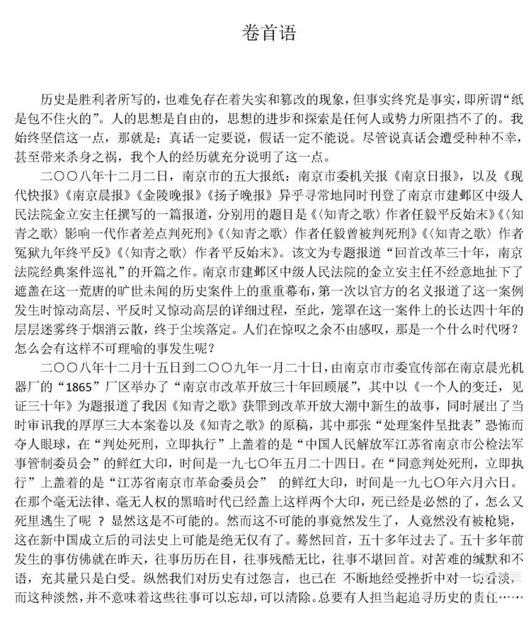 《知青之歌始末》计335页,图文并茂,37万字,129幅约180照片,以独特的视角,讲述了上世纪六七十年人人都知道的上山下乡运动中,一个不为一般人所知的知青在狱中的故事。因歌判死刑,刑场陪杀,回校批斗,校长忠言,同学反目,……,刀下留命,平反出狱,平静待世。在中国知青史,中国音乐史,中国法院史留下特别的一页。