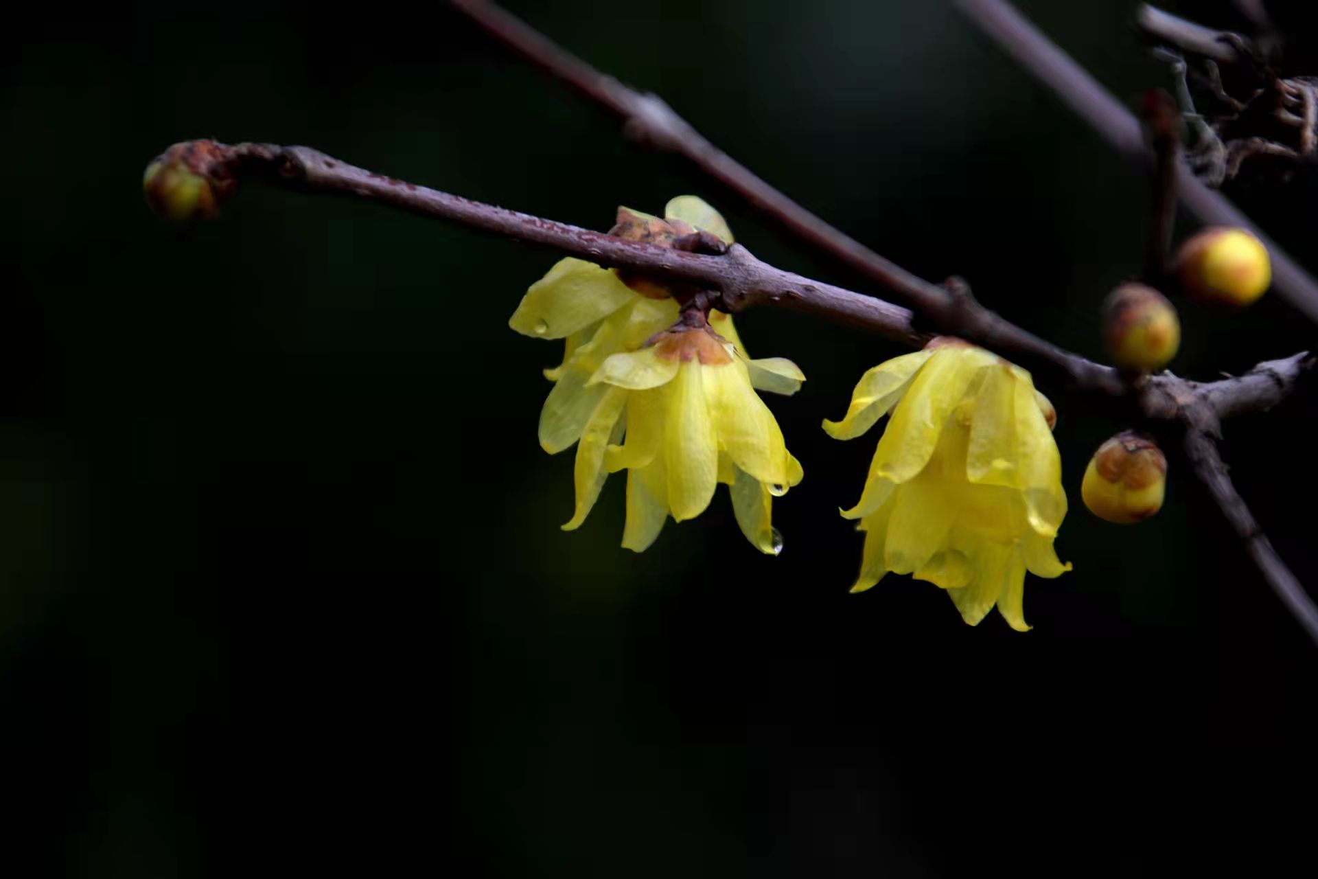 年腊月,数九小寒辰。冷雨夜侵闺梦扰,铁枝珠挂蜡梅新,春草正殷勤。