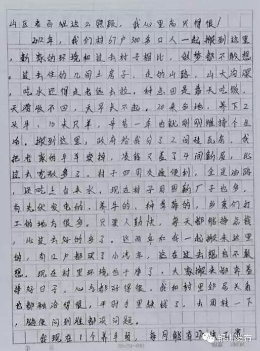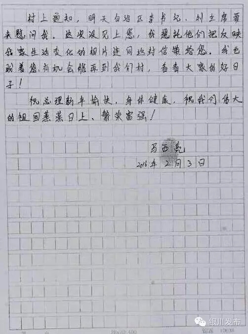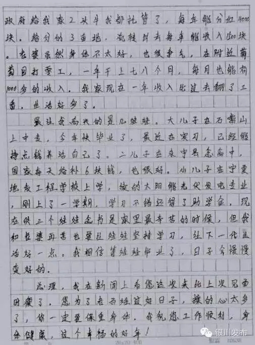 前些日子,听说您要来宁夏,还要来我们新家做客,全家都激动高兴得不得了,一直做梦都盼望着总理能来看看我们的新家,我专门把女儿从固原老家叫来帮着收拾家里,我老婆每天把房子打扫好几遍。我一想这次还能见见总理,和您握握手,估摸着那时候会高兴地流眼泪呢。我知道您工作忙得很,虽然这次没有到我家,但从我儿子的手机上,看到您来宁夏的相片,知道您一直挂念着宁夏人民,对咱们山区老百姓这么照顾,我心里高兴得很。
