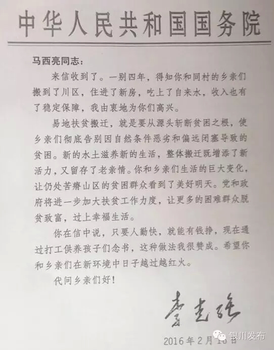 “一别四年,得知你和同村的乡亲们搬到了川区,住进了新房,吃上了自来水,收入也有了稳定保障,我由衷地为你们高兴。易地扶贫搬迁,就是要从源头斩断贫困之根,使乡亲们彻底告别因自然条件恶劣和偏远闭塞导致的贫困。新的水土滋养新的生活,整体搬迁既增添了新活力,又留存了老亲情。你和乡亲们生活的巨大变化,让仍处苦瘠山区的贫困群众看到了美好明天。党和政府将进一步加大扶贫工作力度,让更多的困难群众脱贫致富,过上幸福生活。你在信中说,只要人勤快,就能有钱挣,现在通过打工供养孩子们念书,这种做法我很赞成。希望你和乡亲们在新环境中日子越过越红火。”在回信里,总理还请马西亮代问乡亲们好。