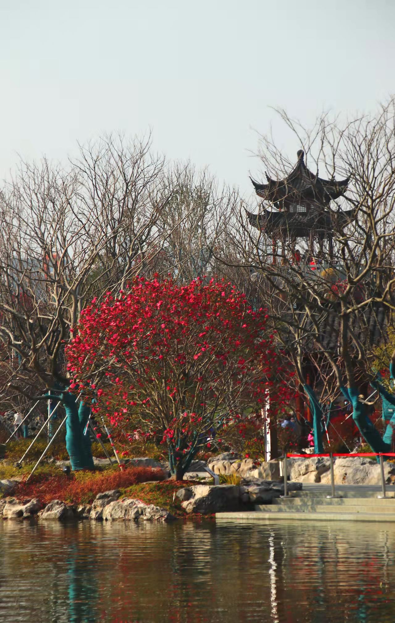 还在排队时,就看见湖边有一树红花,开得正艳,映照着山上的亭子,如火焰般灼灼地燃着。