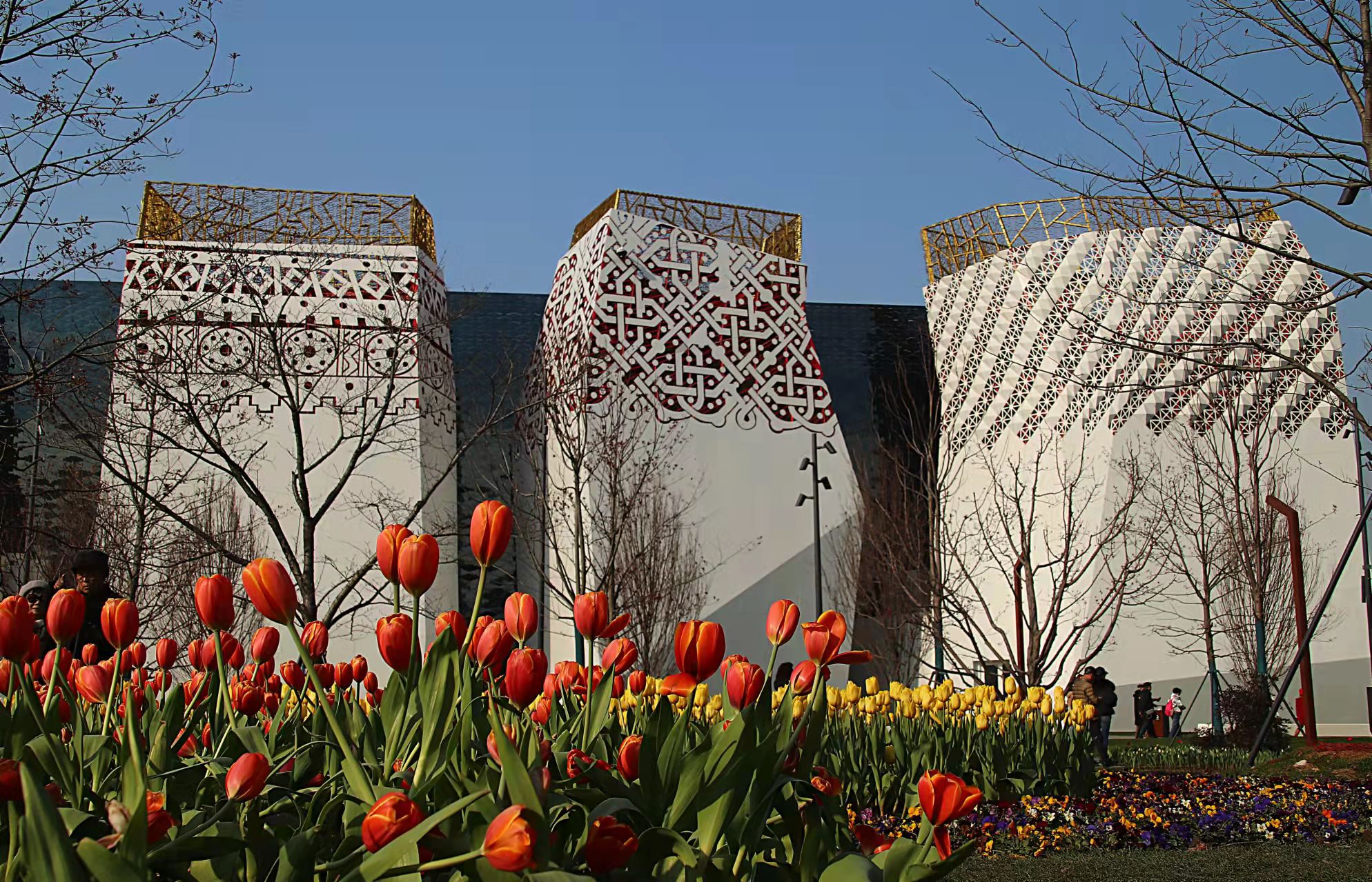 郁金香花海就从这是向东延伸,衬着后面极具俄国风格的俄罗斯馆,让人叹为观止。