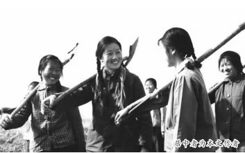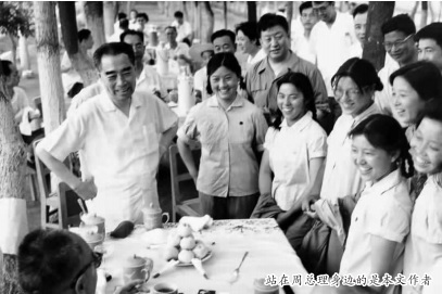 下午3点多钟,我们一行急匆匆从二分场一条长廊般林带东边向西步行。我一向步伐较快,首先看到总理站在一张方桌旁谈话,急忙向大家说:“总理就在前面,快来!”一边飞速来到总理身旁。大家一齐拥上前,争着同周总理和陈毅副总理握手。摄影记者争着拍下这珍贵的历史镜头。我就是站在总理左侧、满面笑容聆听总理教诲的女知青。