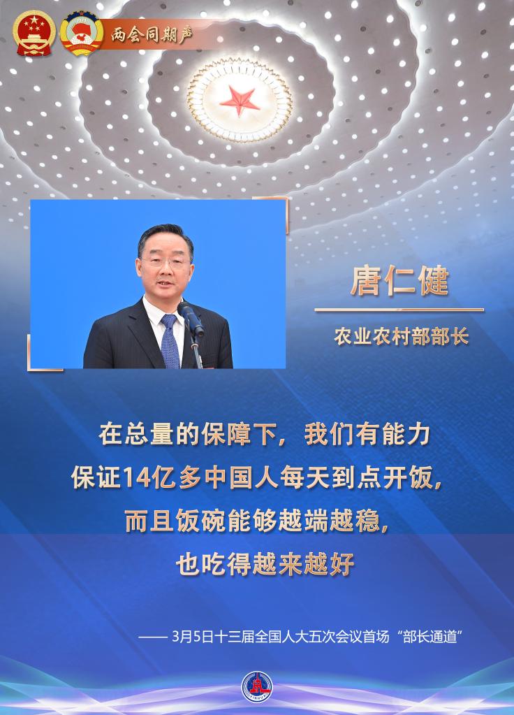 “目前我们粮食供给的总量充裕。今年人均粮食占有量达到483公斤,比去年的474公斤增加了9公斤。在总量的保障下,我们有能力保证14亿多中国人每天到点开饭,而且饭碗能够越端越稳,也吃得越来越好。”唐仁健说。