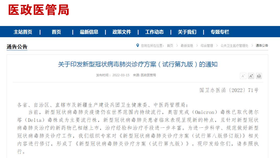 中国网3月16日讯 据国家卫生健康委员会官方网站消息,为进一步做好新冠肺炎医疗救治工作,切实提高规范化、同质化诊疗水平,国家卫生健康委和国家中医药管理局组织专家对《新型冠状病毒肺炎诊疗方案(试行第八版修订版)》进行了修订,形成了《新型冠状病毒肺炎诊疗方案(试行第九版)》,并印发各地参照执行。新版诊疗方案是在认真研究德尔塔、奥密克戎等变异毒株传播特点和病例特征,深入分析相关研究成果的基础上形成的。