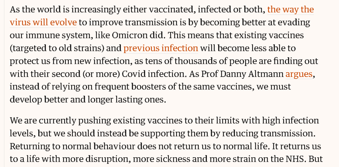 再次,人们误以为疫苗的接种工作已经完成了,所以现在应该放开了,比如英国的疫苗接种率就很高,尤其是老年人等弱势群体。然而,疫苗的保护力往往在几个月后就会逐渐消失,加强针虽然能提供更多帮助,但也需要时间去完成接种。与此同时,病毒也在继续变异,奥密克戎毒株就已经突破了之前疫苗构建的免疫防线,这意味着之前的疫苗产生的保护力已经不足够对抗新的疫情,不少二次感染的人就已经感受到了这个现实。所以,除了疫苗,眼下还需要其他防疫措施去减少疫情扩散。如果急着恢复常态,反而会导致更多对日常生活的扰乱,导致更多人发病,并给医疗资源造成更大的压力。