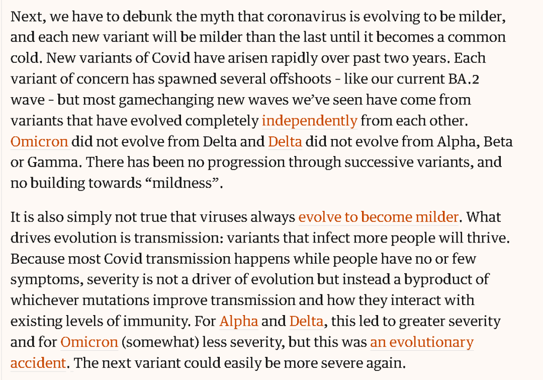 其次,人们认为新冠病毒的变异路径一定是“越变毒性越轻”的,误以为新冠病毒的毒株最终会变异成接近普通感冒的水平。可问题是,奥密克戎毒株并不是从德尔塔毒株变异过来的,而是独立变异的,就像德尔塔毒株也不是从阿尔法毒株变异过来的一样,这些毒株之间并不存在变异上的继承关系。同时,病毒毒株在人群中的变异并不都是越变毒性越弱的,因为决定毒株变异因素的并不是毒性,而是传染性,毒性只是这种变异过程中的一个副产物。换言之,奥密克戎的毒性偏弱以及德尔塔的毒性偏强,其实都是病毒在变异过程中随机出现的,所以不排除下一种新出现的毒株反而毒性会比奥密克戎更强。