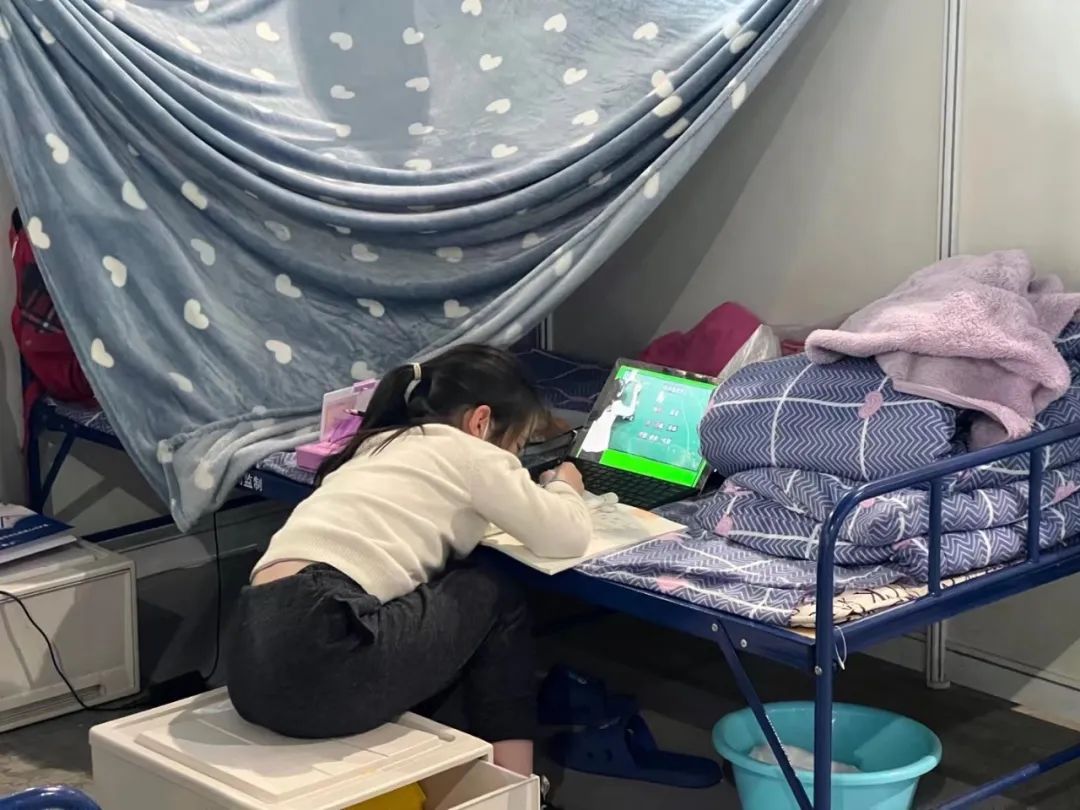 我在这里能看到孩子们在各自床位上网课。据我见大多数孩子都是和大人一起来隔离的,孩子们之间也会玩在一起。