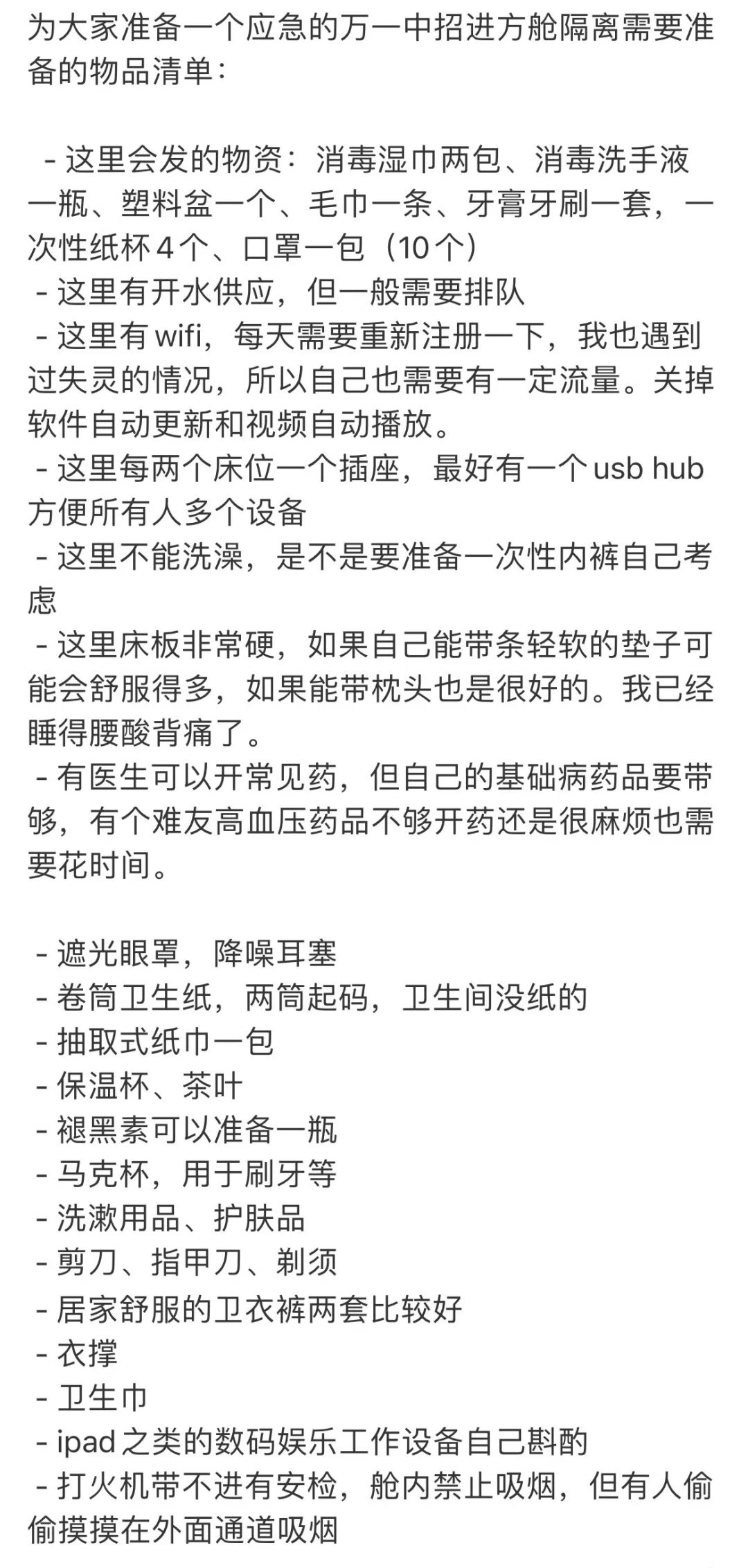 所以,做足充分准备很重要。像我之前在微博上分享了一张进方舱准备物品清单(见文末),里面包括指甲刀、剃须刀、剪刀这些,都是能带进来的。