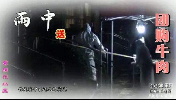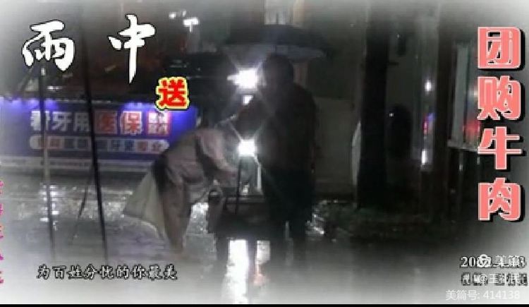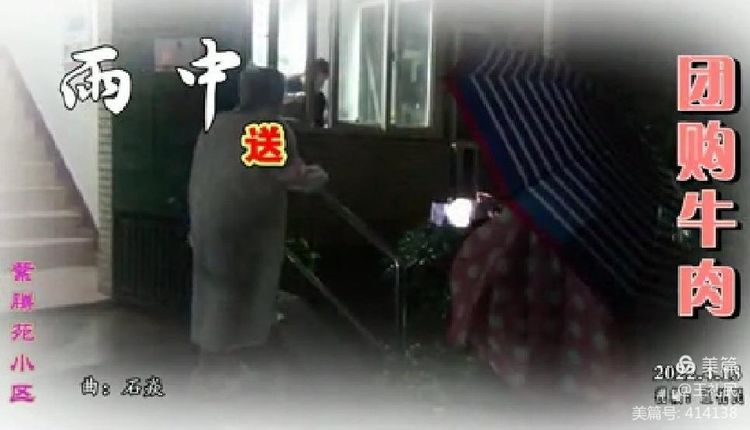 2022年4月13日 夜八点 大雨 滂沱 紫腾苑 二位雨中人,一位撑伞,推平板车;一位着雨衣,敲门送团购牛肉。