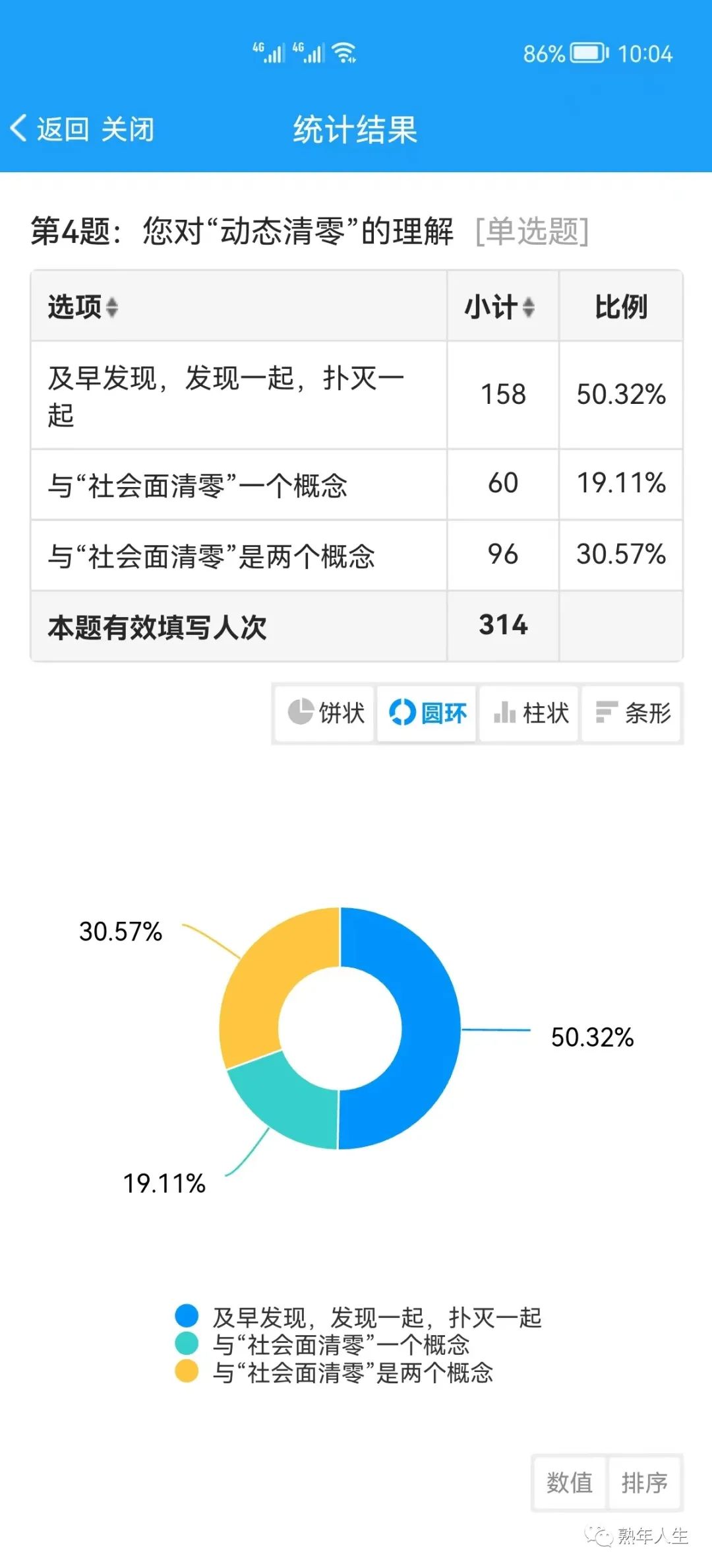 “及早发现,发现一起,扑灭一起”占50.32%;与“社会面清零”是两个概念,占30.57%;与“社会面清零”一个概念,占19.11%。