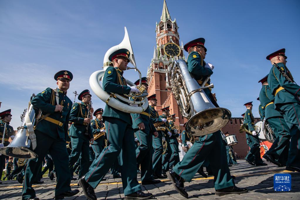 5月7日,在俄罗斯首都莫斯科,军乐团在总彩排开始前列队行进。