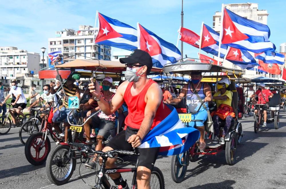2021年8月5日,数百名古巴青年在首都哈瓦那举行保卫国家和平、团结反美游行,要求美国解除对古巴近60年的封锁。新华社发(华金·埃尔南德斯摄)