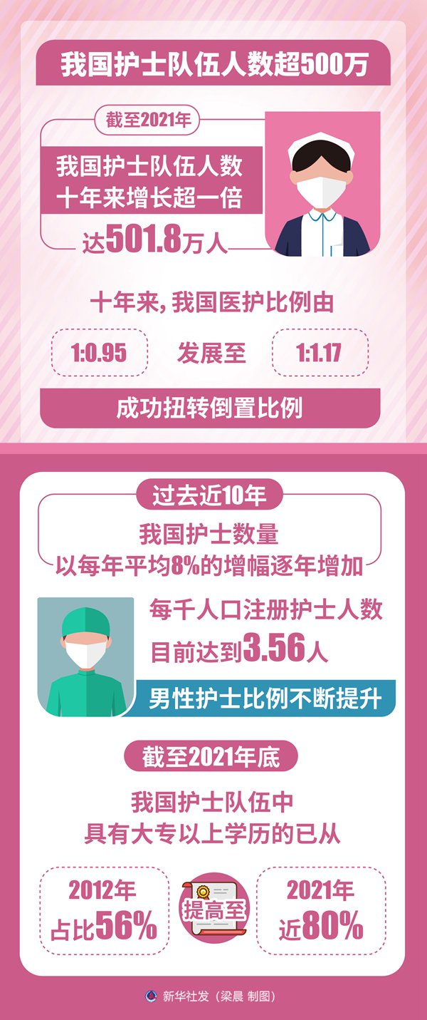 护理事业服务于人的生老病死全过程,是人民健康的重要守护者。5月12日国际护士节来临之际,一组数据显示,截至2021年,我国护士队伍人数十年来增长超一倍,达501.8万人;十年来,我国医护比例由1:0.95发展至1:1.17,成功扭转倒置比例。