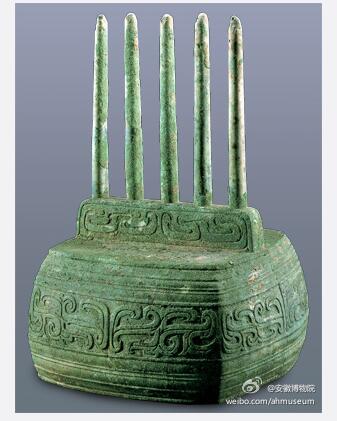 云纹铜五柱器:它曾引发广泛关注,原因之一是外形酷似现代的路由器。其实,在安徽博物院官网可以看到,这件文物名为“云纹铜五柱器”,断代为西周。其用途待考。