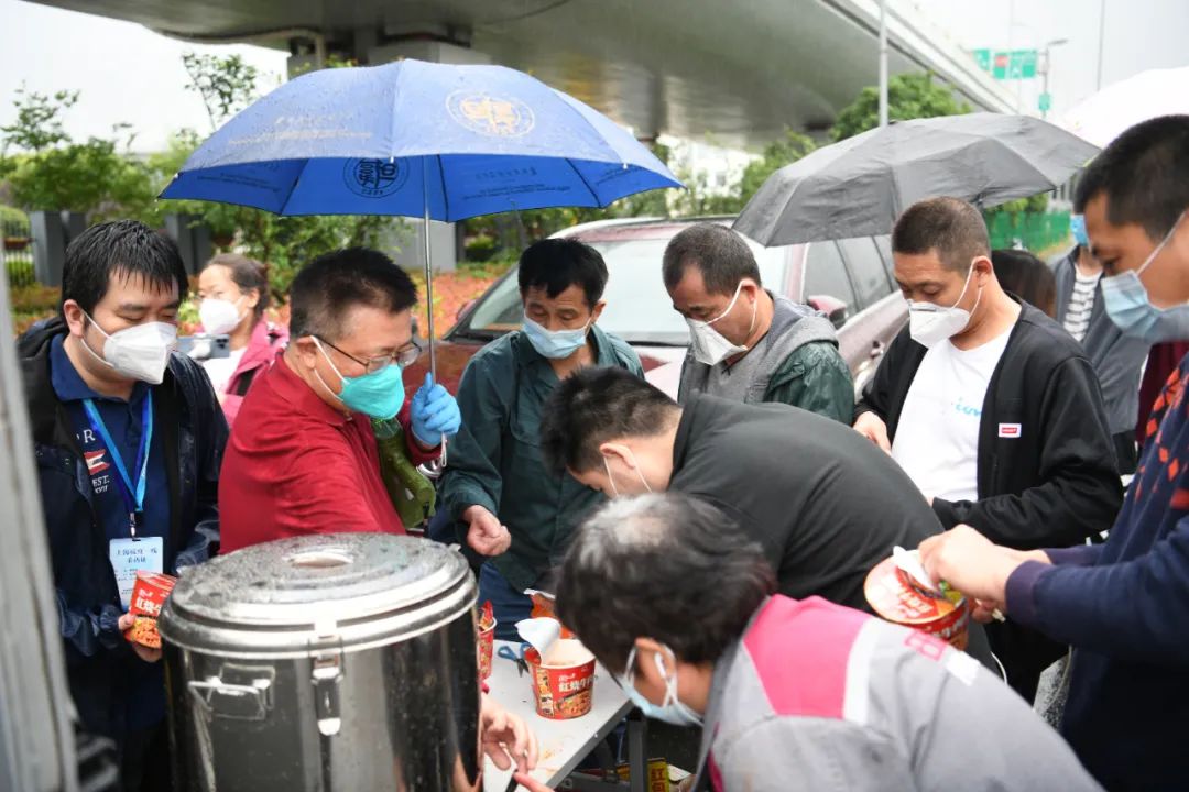 昨晚在雨中,在520这个特殊的日子,我们当场冲泡这300盒方便面,一一送给滞留者。虽然目光所至,很多滞留者都疲惫、无奈、甚至有一点点伤心,但我们依旧想对每一个即将离开上海的人说:谢谢你们来过上海!