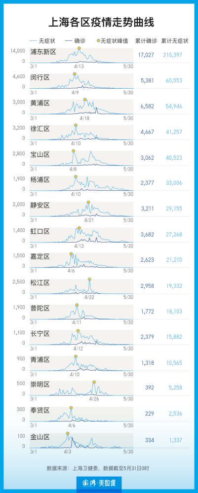 截至5月31日,过去3个月,全市累计新增本土阳性感染者超60万例,经历了高峰、拐点、下落。其中,浦东新区累计感染者人数最多。