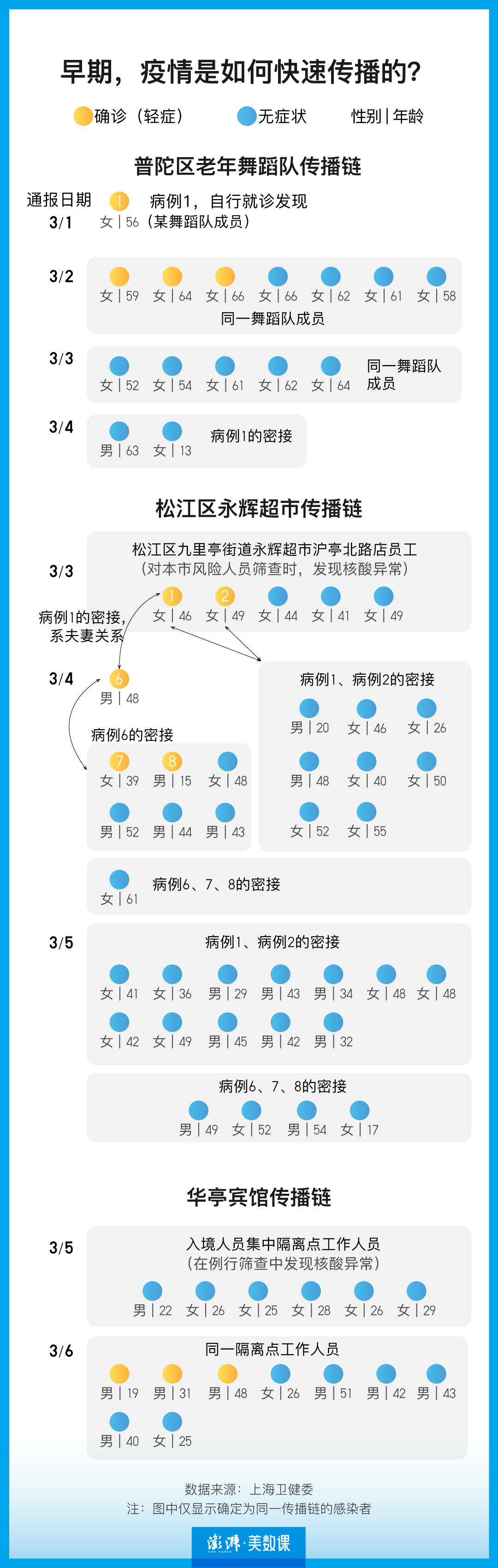 3月1日确诊的本土病例,在普陀区老年舞蹈队牵出了一条完整的传播链。短短三天内,已知与该点位相关的感染者已达到21人。