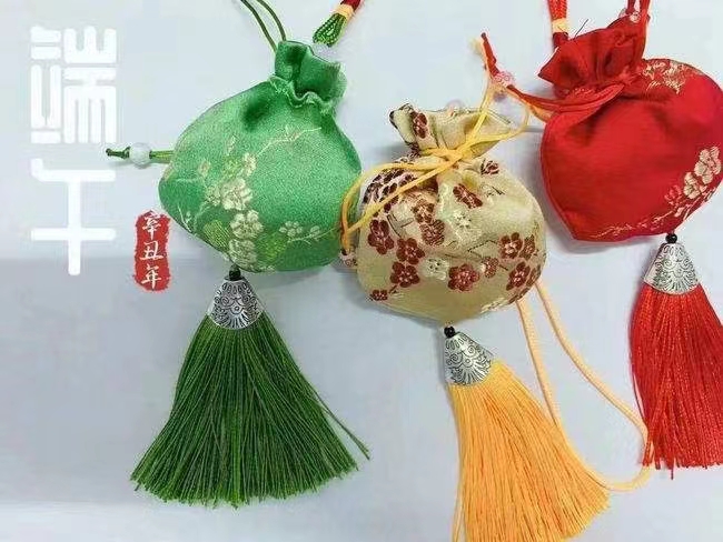 宋代大文豪苏轼的一首《浣溪沙·端午》:“轻汗微微透碧纨,明朝端午浴芳兰。流香涨腻满晴川。彩线轻缠红玉臂,小符斜挂绿云鬟。佳人相见一千年。”聊表了对端午节的慰藉,也阐明了自古就有佩戴香袋的习俗。虽说是一种习俗,但实际上是古代人民预防瘟疫的一种方法。民间曾有“戴个香草袋,不怕五虫害”之说。香囊常用的是具有芳香开窍的中草药,如芳香化浊驱瘟的苍术、山奈、白芷、菖蒲、川芎、香附、辛夷等药,含有较强的挥发性物质。