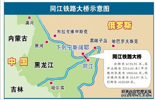 中俄同江铁路界河桥位于中国黑龙江省同江市与俄罗斯犹太自治州下列宁斯阔耶之间,我国境内线路全长31.62公里,其中跨江大桥主桥全长2215米(我国境内长1900米)。中方投资估算26.42亿元人民币,建设工期为两年半,设计年过货能力2100万吨。