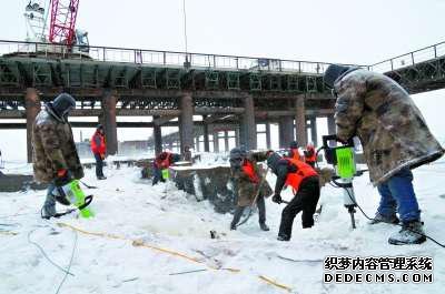3月,中铁大桥局建设者在雪中施工。