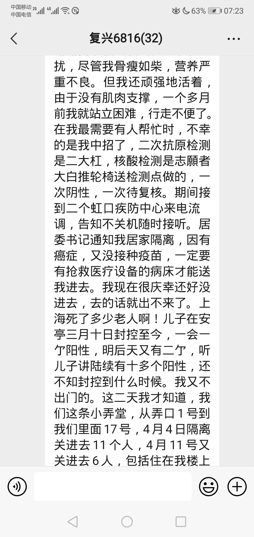 可是由于该同学从网上得知方舱医院只是隔离并没有药物治疗和其他治疗,更没有针对他的癌症疾病的治疗方案,而且生活、居住条件并不好,所以他不愿意去方舱医院。第二天,他的核酸检测结果是阴性,所以他还是选择在家躺着,没有人服侍,他吃饭也成了大问题。不过他根本也吃不下什么,用电饭煲做点粥,可以吃好几天,完全谈不上什么营养。他的弟弟、弟媳住在他楼上,也因为之前已经得了新冠去了方舱医院。也没有办法照顾他。我们的小学同学、中学同学、插队知青朋友以及老师,只能通过微信对他进行了关心问候和资助,无奈封控期根本无法探望关心,也没有办法帮他解决根本问题,心有余而力不足,只能眼睁睁看他听天由命。幸亏不多久他弟弟就回来了,过来看了他,总算不至于让他更加凄凉。