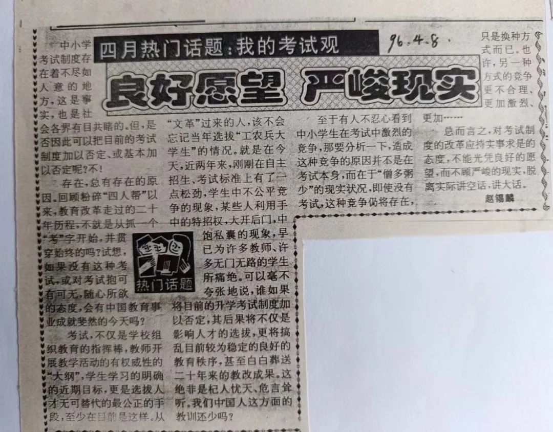 存在,总有存在的原因。回顾粉碎“四人帮”以来,教育改革走过的二十年历程,不就是从抓一个“考”字开始,并贯穿始终的吗?试想,如果没有这种考试,或对考试抱可有可无,随心所欲的态度,会有中国教育事业成就斐然的今天吗?