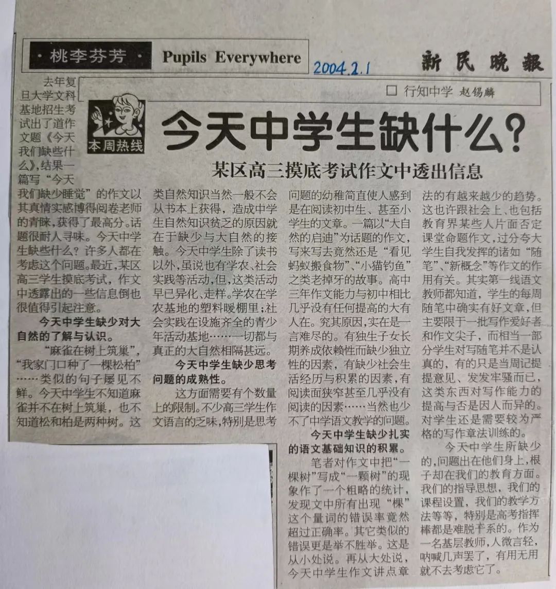 今天中学生所缺少的,问题出在他们身上,根子却在我们的教育方面。我们的指导思想,我们的课程设置,我们的教学方法等等,特别是高考指挥棒都是难脱干系的。作为一名基层教师,人微言轻,呐喊几声罢了,有用无用就不去考虑它了。