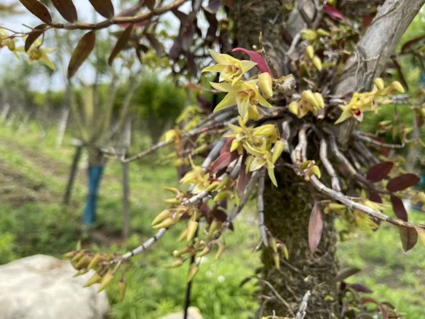走进罗泾镇新陆村林下经济实验基地,只见枣树、石榴树、银杏树等三千多株果树排列整齐屹立园中。原本果树下种植的大球盖菇已经采摘完毕,在疫情封控期间去往了上海的千家万户。而仔细查看之下,每株果树的树干上,都伴生着一圈圈造型奇特的“小花”。原来这就是最近实验基地出产的新作物“石斛花”。