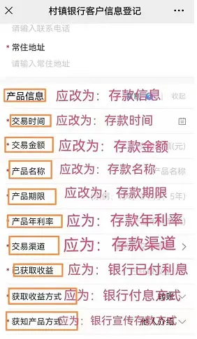 王女士告诉凤凰网财经《银行财眼》,村镇银行发布的客户资金登记里的每一项都有问题,包括“产品信息”应改为“存款信息”、“交易金额”应改为“存款金额”、“获取收益方式”应改为“银行付息方式”等等。她认为这些客户资金登记的名称对储户存款的定性有不利影响,所以很多储户不愿意登记。