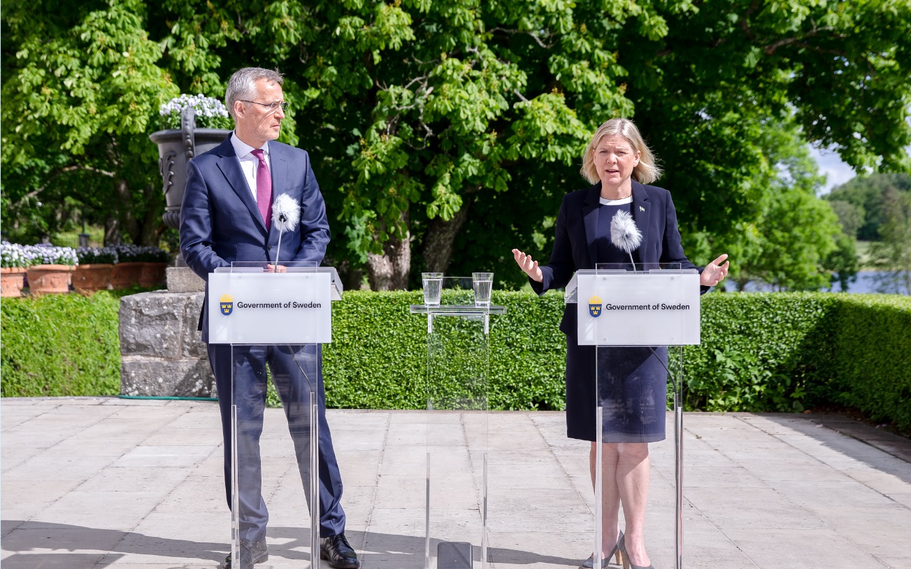 6月13日,瑞典首相安德松(右)与到访的北约秘书长斯托尔滕贝格在瑞典首都斯德哥尔摩出席新闻发布会。斯托尔滕贝格表示,瑞典和芬兰申请加入北约的流程比预期复杂,两国获准入约的具体时间“无法确定”。图/新华社