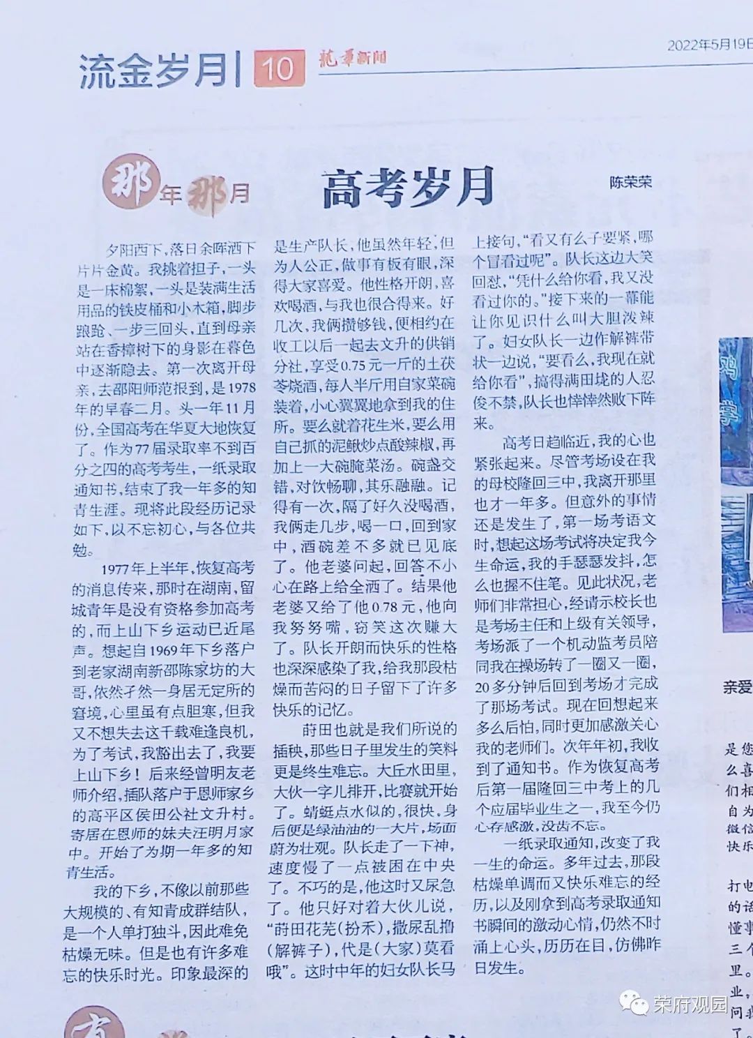 高考日趋临近,我的心也紧张起来。尽管考场设在我的母校隆回三中,我离开那里也才一年多。但意外的事情还是发生了,第一场考语文时,想起这场考试将决定我今生命运,我的手瑟瑟发抖,怎么也握不住笔。见此状况,老师们非常担心,经请示校长也是考场主任和上级有关领导,考场派了一个机动监考员陪同我在操场转了一圈又一圈,20多分钟后回到考场才完成了那场考试。现在回想起来多么后怕,同时更加感激关心我的老师们。次年年初,我收到了通知书。作为恢复高考后第一届隆回三中考上的几个应届毕业生之一,我至今仍心存感激,没齿不忘。