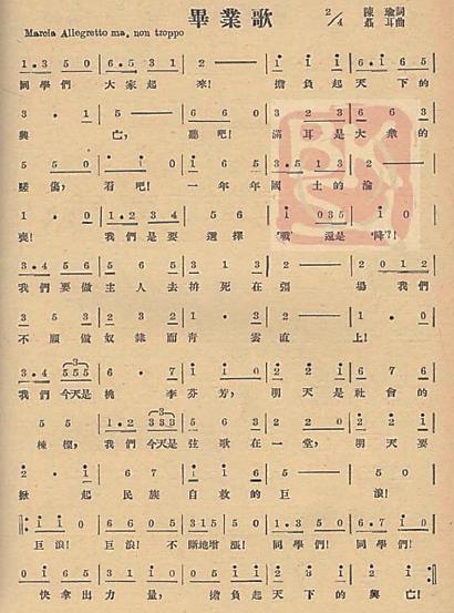 1938年,吴涵真主编的抗战时期发行量最大的一部抗战歌曲集《叱咤风云集》将《毕业歌》作为抗战“大众歌曲”予以郑重推介。同年,上海大众歌声社编辑出版了一本抗日救亡歌集,里面收录了聂耳抗日爱国歌曲遗作十二首,《毕业歌》名列第三,仅次于《义勇军进行曲》和《前进曲》。可见,在时人心目中,《毕业歌》与抗日救亡、与民族最危险的时候有多么直接、深刻的联系。