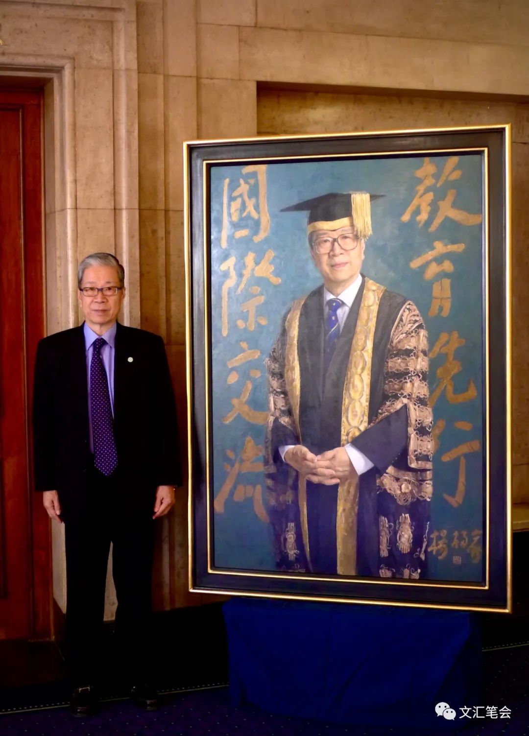 舅舅在诺丁汉大学任职整整十二年,超过他在复旦的任期。按诺丁汉大学的校规校长任期不能超过两届,学校为他专门修改了校规。他任职期间,在校召开了世界中药联盟大会、成立了中国政策研究院,特别是在我们故乡宁波开办了中国第一所中外合作办学的宁波诺丁汉大学。而鉴于他对诺丁汉大学的贡献,学校将校园里最漂亮的一栋楼——由英国著名建筑师Ken Shuttleworth设计的大楼——命名为“杨福家楼”,并请了英国皇家人像画家协会会员Keith Breeden耗时三年,完成了一幅杨福家校长的巨制,肖像画的底板衬着杨福家亲笔书写的八个大字:“国际交流、教育先行”(下图)。这幅巨型肖像画将永远悬挂在诺丁汉大学的纪念堂里。由于一个人,而使中国的形象、中国的声音、中国的文化,得到如此广泛与深刻的传播,既极为难得,又意义深远。在所有传播力中人是最强大的传播力,中国屹立于世界民族之林需要无数个杨福家!