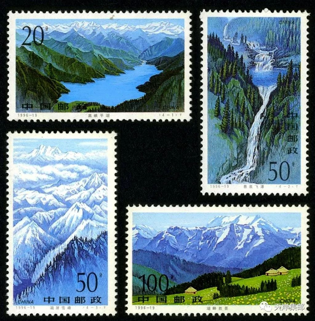 1996年8月8日,我国发行志号为1996-19的《天山天池》特种邮票全套4枚。这是一套展现天山天池风光的专题邮票。《天山天池》邮票将4处天山天池有代表性的自然景观绘入邮票画面。图案分别为“高峡平湖”、“悬泉飞瀑”、“湖平雪峰”和“湖畔胜景”。