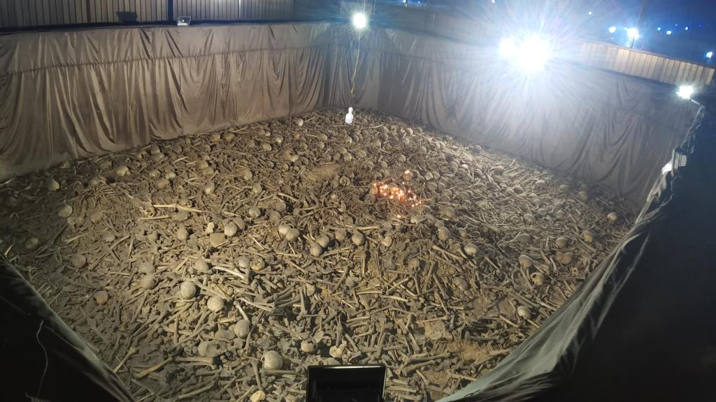 树木掩映下的白色展馆静谧、庄严,拾级而上,展厅中央一个大坑被玻璃围住,透过玻璃,只见数不清的白骨散落其中,仿佛在向人们诉说一段苦难的历史。
