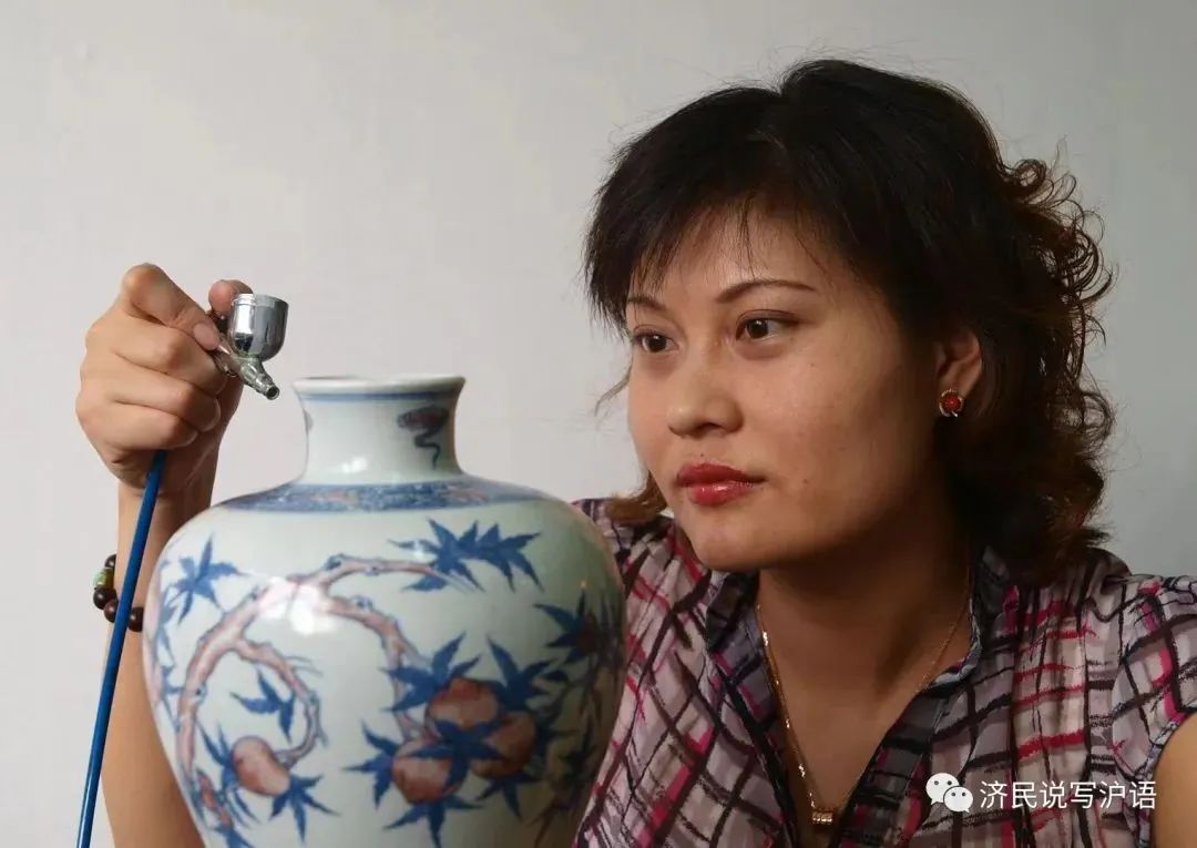 安玲玲告诉我,古陶瓷修复技艺是一项综合造型、雕塑、色彩、书法、绘画、化工等的特殊艺术创作。古陶瓷修复必须一件一件精雕细琢。一条看似简单的青花线条,在修复过程中仍然要做到“色分五彩”。整个修复过程包括拆卸、清洗、补缺、打磨、打底、上色、上釉、做旧等多个步骤。2011年,古陶瓷修复技艺入选第三批上海市非物质文化遗产名录。2014年,古陶瓷修复技艺经国务院批准列入第四批国家级非物质文化遗产名录。目前,她的古陶瓷修复技艺已申报虹口区区级非遗项目。