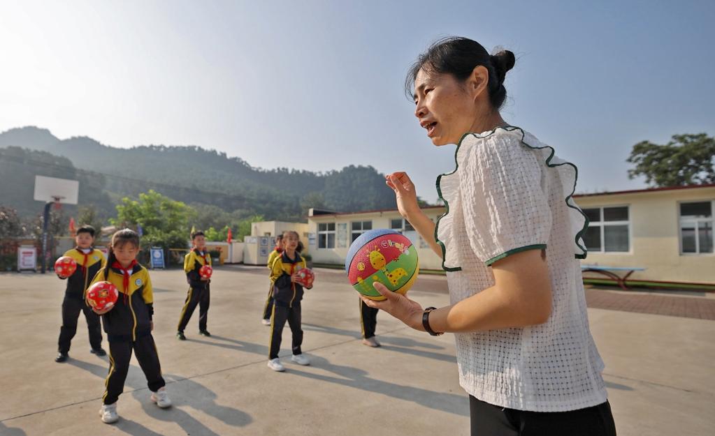 9月7日,张海艳在给3年级学生上体育课。付卫峥 摄