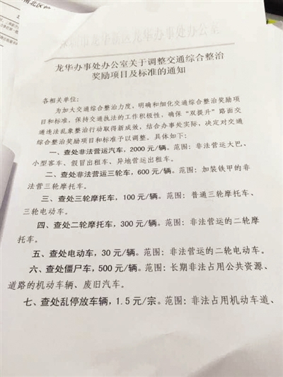 记者在一份由深圳龙华新区龙华办事处办公室出具的《关于调整交通综合整治奖励项目及标准的通知》的文件中发现,为加大交通综合整治力度,明确和细化交通综合整治奖励项目和标准,保持交通执法的工作积极性,办事处决定对交通综合整治奖励项目和标准予以调整,其中加装铁甲的非法营运三轮车每查处一辆奖励600元,普通三轮摩托车、三轮电动车每辆奖励100元,对无证驾驶、妨碍执法当事人实施行政拘留的,拘留一人奖励500元。