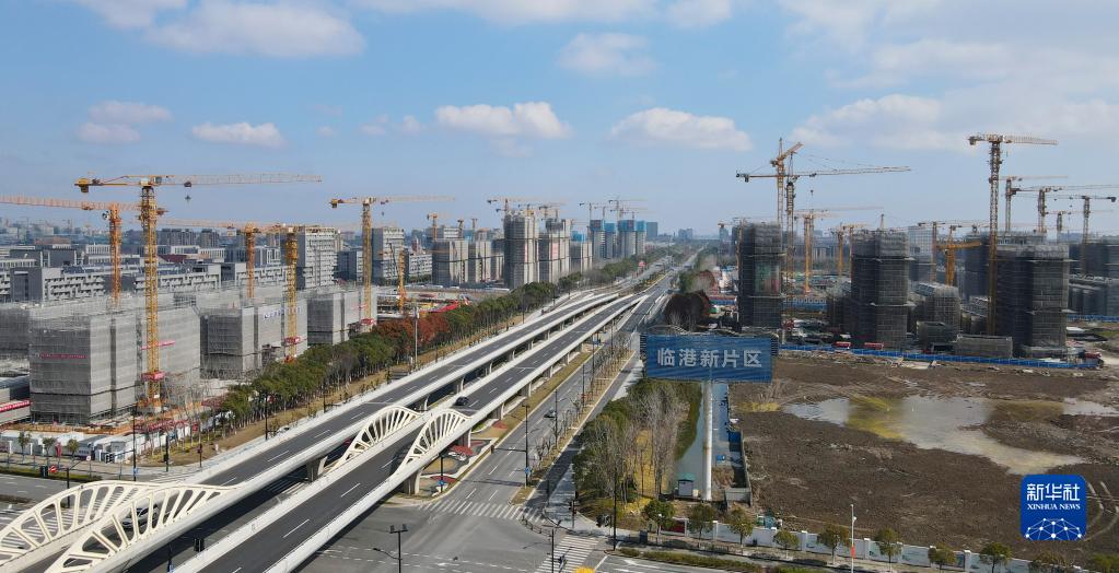 中国(上海)自由贸易试验区临港新片区申港大道两侧塔吊林立(2022年2月10日摄,无人机照片)。新华社记者 方喆 摄