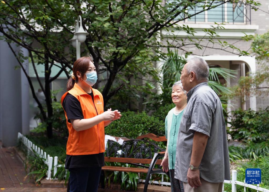 在上海静安区石门二路街道新福康里,居民区党总支书记魏瑛(左)在和居民交流(2022年9月15日摄)。新华社记者 刘颖 摄