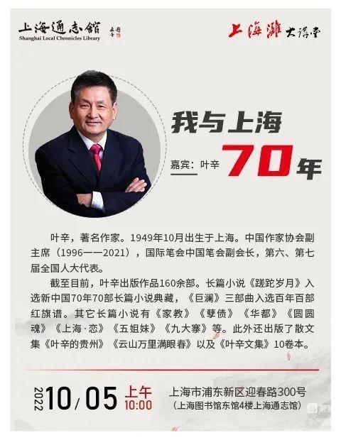 在欢度共和国73年华诞的节日里,2022年10月5日上午10时,上图东馆的上海通志展示馆举办开馆后的第一场【上海滩大讲堂】由著名作家叶辛老师为大家讲述“我与上海70年”,与共和国同步见证大上海变迁。