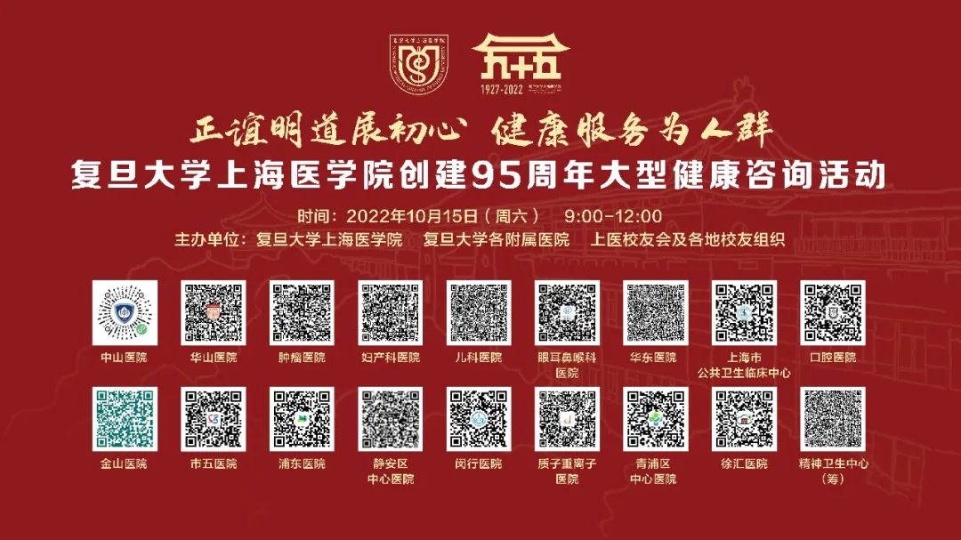 为贯彻落实健康中国战略,弘扬“为人群服务,为强国奋斗”的上医精神,以实际行动迎接党的二十大胜利召开,值此复旦大学上海医学院(原上海医科大学)创建95周年之际,复旦上医齐聚多方优质医疗资源,以线上线下结合的方式举办“正谊明道展初心,健康服务为人群”——复旦大学上海医学院创建95周年大型健康咨询活动。